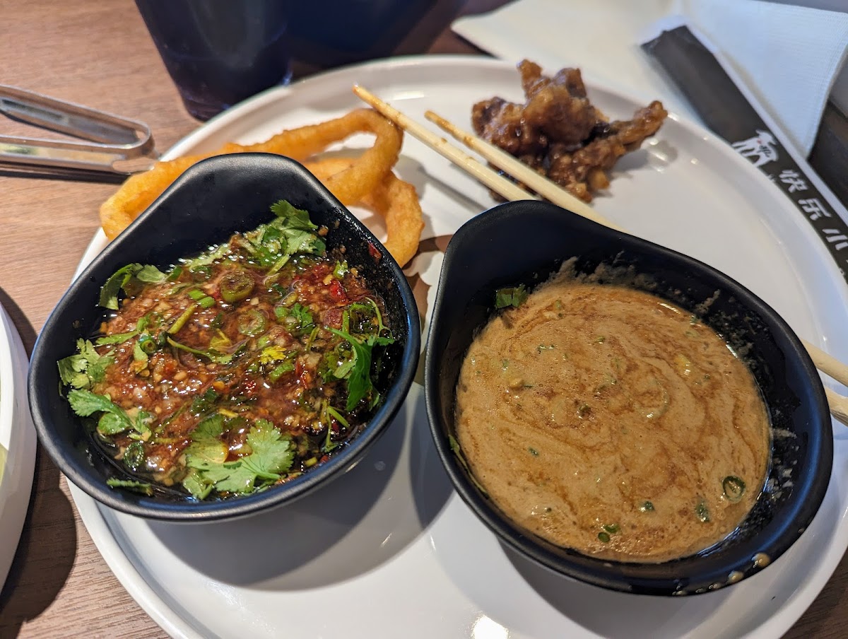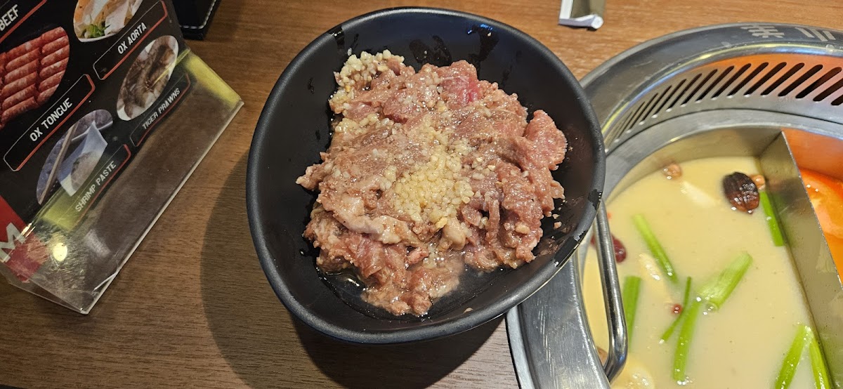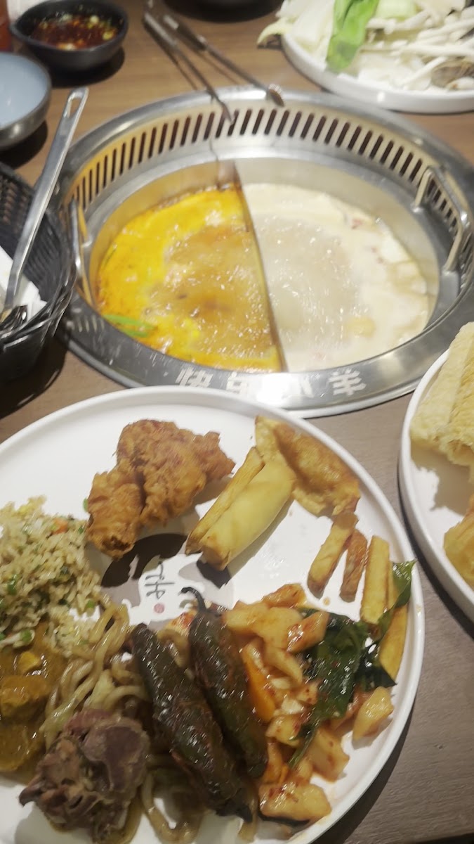 Nice and clean Chinese hot pot place. It’s quite pricey but the meat quality is good. Their sour and spicy golden soup (whatever they called it) is good. Although the spicy soup is a bit too bland for my liking. The food bar area is clean and well-kept. They continue filling veggies and hot food. They might not have the biggest selection of hot foods but the quality is very good—what is supposed to he crispy is crispy, nothing too oily or salty. Will definitely be back. I would recommend you to go with premium option as the Australian wagyu is very good and probably worth the few extra dollars (especially if you go during the weekend)